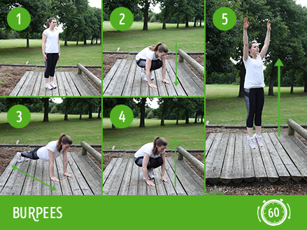 - BURPEES. Stand with your arms by your side, lower into a squat and put your hands flat on the floor in front of you. Whilst on the floor, kick your legs back and get into the push-up position, lower your chest to the floor, then back up to the push-up position before returning to the squat. Jump up, raise both hands in the air - repeat.