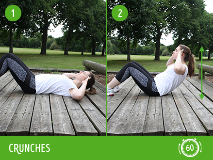 - CRUNCHES: Lie down on your back, and raise your upper body off the floor. Place your hands by your head and squeeze into your abs, lifting your body up more - repeat.