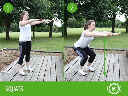 - SQUATS: Stand with your feet shoulder width apart and your arms out in front of you. Focus on something in front of you and stay focused on it as your bend your knees and crouch down. Keep your back straight and return to upright position - repeat.