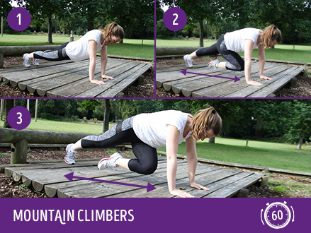 - MOUNTAIN CLIMBERS: Begin in a push-up position, toes grounded to the floor. Bring one knee up to the opposite side of your chest, then straighten it back to floor, and repeat with the other leg. Try to do this in quick, explosive movements to make the most of the exercise.