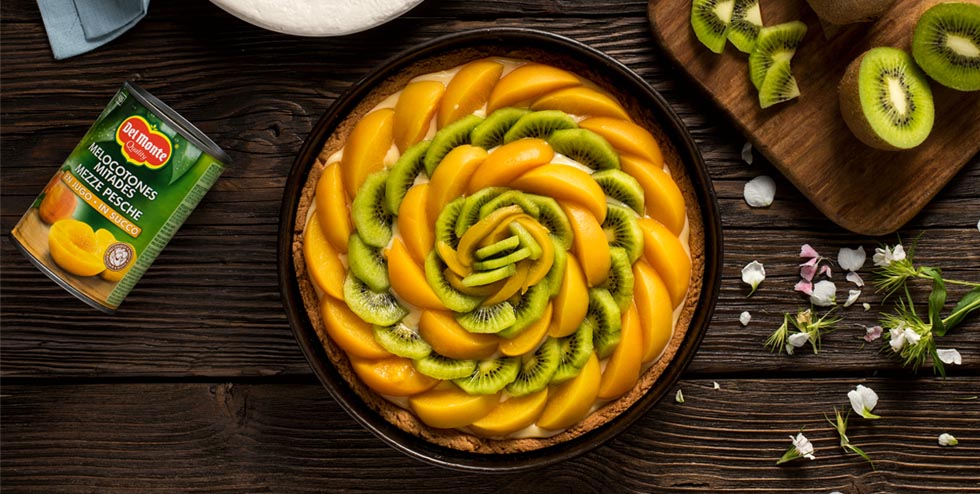 1)Butter the pan, sprinkle it with flour and put it in the fridge. 2)Melt the butter in a bain-marie and then work it with the sugar, lemon zest, then add one egg at a time. Then using the strainer, drizzle the flour on it and mix it. 3)Add a little milk and stir everything. 4)Pour everything into the cold pan and adjust with spoon. 5)Bake in preheated oven at 170° for 20/25 minutes. Once baked, turn it upside down, let it cool and stuff it. 6)For the filling: work 2 eggs with 3 tablespoons of sugar, add two tablespoons of flour, and a piece of lemon peel in the milk that you will heat in a jug. 7)Finally, once stirred, incorporated in the cream, simmer for a few minutes, add butter flakes and then let it stand covered stirring occasionally. 8)Stuff the cake and garnish with Del Monte Peaches and Kiwis.