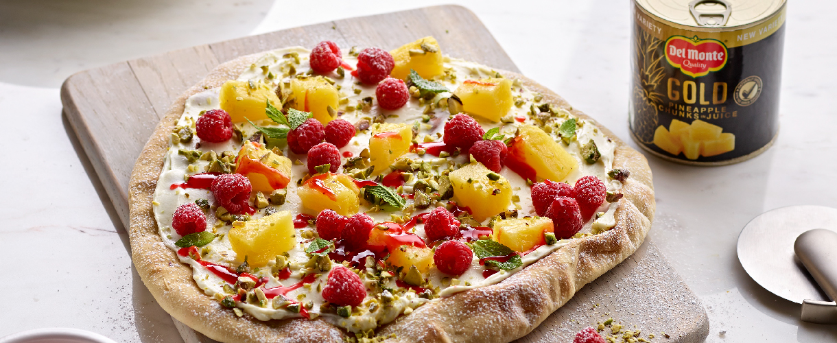 1)Drain the Del Monte Gold® pineapple reserving the juice - set aside the chunks for the pizza. Place the pineapple juice into a saucepan along with the other coulis ingredients. Bring to the boil and allow to simmer for 7 - 10 minutes. 2)Sieve the coulis through a fine sieve to remove the raspberry seeds. Return to a clean pan and simmer and reduce for a further 5 minutes to create a thick, glossy sauce. Set aside to cool until ready to serve. 3)Make and bake the pizza base according to packet instructions. Remove from the oven and allow to cool slightly. In a bowl, combine the mascarpone and icing sugar. Spread over the pizza base and scatter with the reserved pineapple chunks, raspberries, pistachios and mint leaves. 4)Finish with a drizzle of coulis and sprinkling of icing sugar.