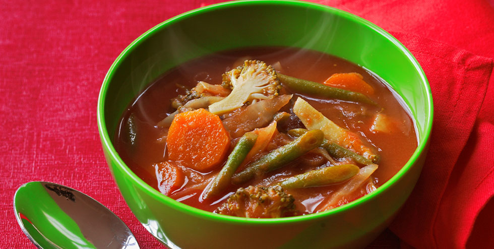 1)Bring the water to the boil in a large saucepan and add the stock cube, Del Monte® Tomato Juice, garlic, spring onions, potato and carrot. Bring back to the boil, then simmer over a low heat for 15 minutes. 2)Add the broccoli, cabbage, green beans and peas. Bring back to the boil, then turn down the heat to simmer. Check the soup after five minutes – the vegetables should be tender, but still firm. 3)Take the soup off the heat and season with salt and pepper. Ladle into four soup bowls and serve.